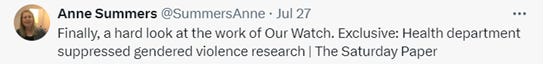 Our Watch wasn’t going to cop any distraction from their gender transformative project – which, under the guise of tackling domestic violence, was actually intent on “social, cultural and structural and systemic change” – essentially redistributing power between men and women. (Read more about Our Watch’s audacious plan for resetting our society in my blog from three years ago.)