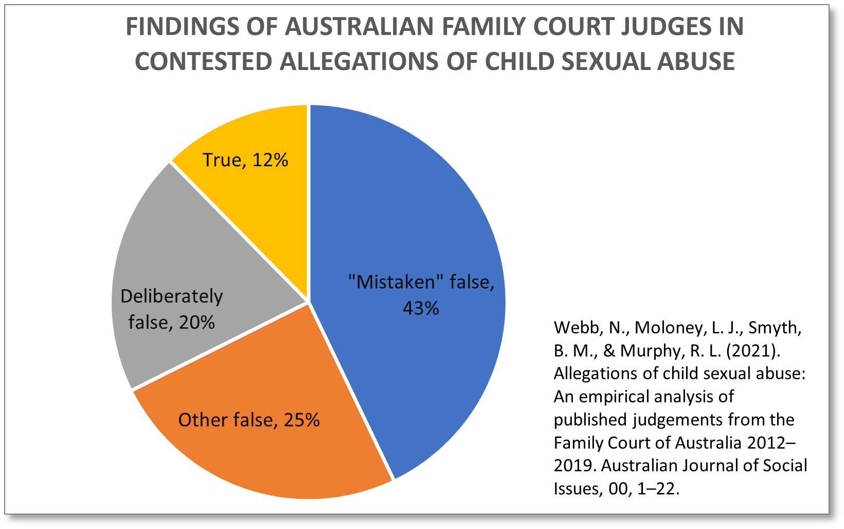 Last month an Australian social issues journal published the most fascinating research - Allegations of child sexual abuse – which showed judges determined that only 12 % of the child sexual abuse allegations involved in contested family court cases were found to be true.