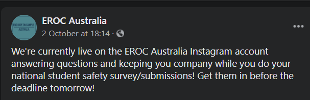 Clearly, that measly result was very disappointing for the feminist activists who’d worked so hard to try to get these numbers up. Look at this social media post from EROC zealots announcing a social media event to keep people company while they complete their surveys. Hmm, surely that’s rather like helping someone fill in their slip at the ballot box.