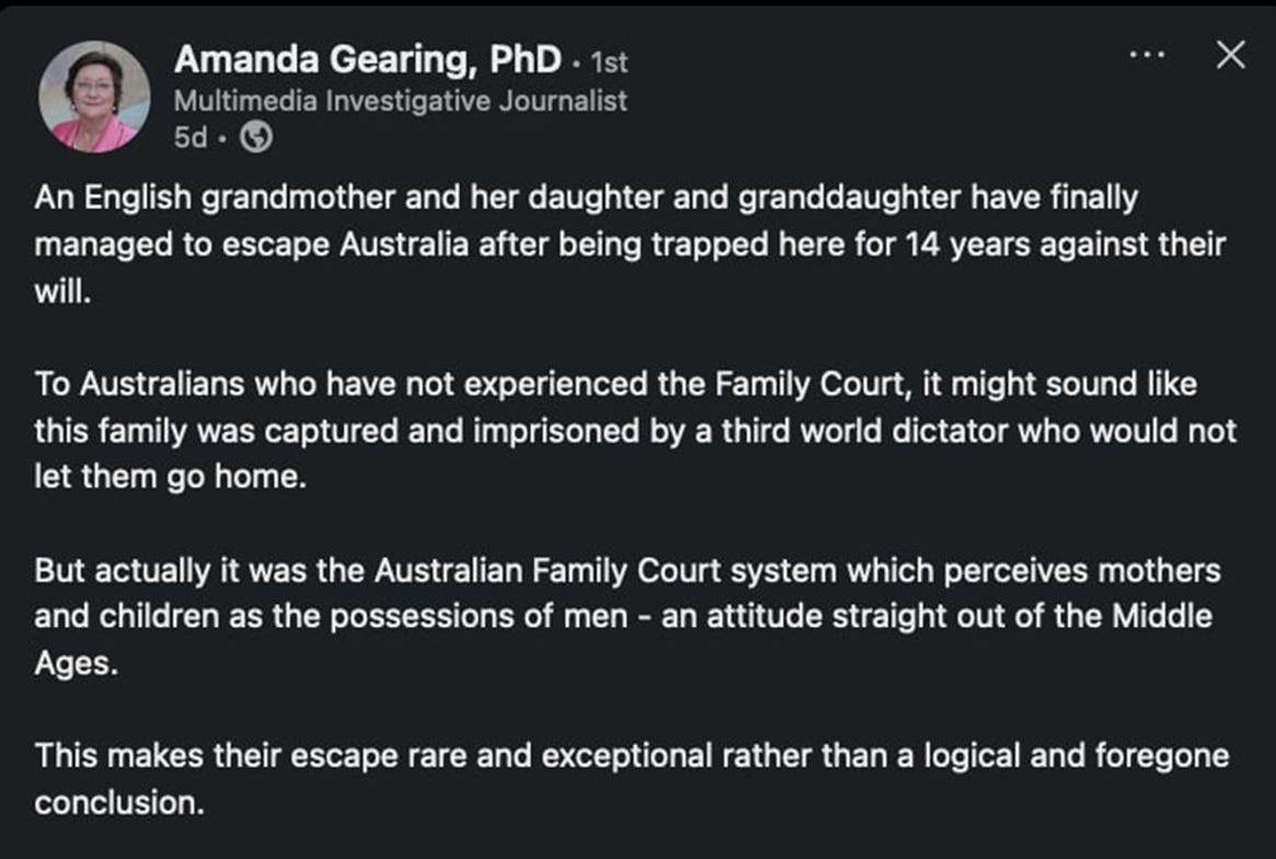 A dismal postscript to this story is Grainger’s ex-wife has recently relocated overseas with the child. She originally left Australia with the child covertly during Covid and then decided to remain there permanently. A Hague Convention case ensued, and she was ordered to return the child to Australia – an order she defied a number of times. In 2022 the mother retrospectively applied to the Australian Family Court for permission to relocate overseas with the child, which was granted last year. So, the mother was given permission to return to the UK, having successfully alienated the child from Grainger after allowing no contact for almost a decade.