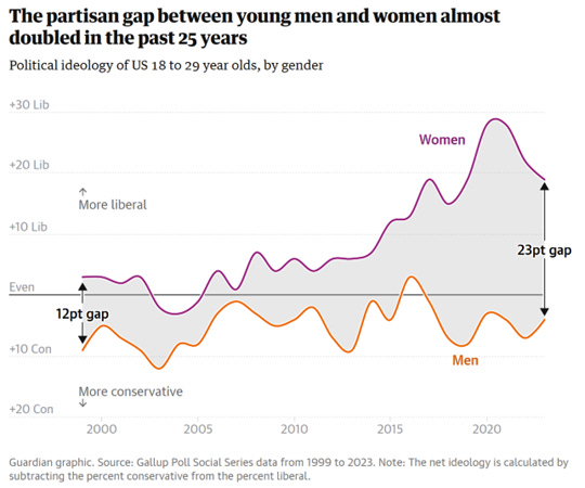 Young men are increasingly disenchanted by the woke politics of the left. The Guardian article included this Gallop Poll graph showing the growing gap in political ideology of young men and women.